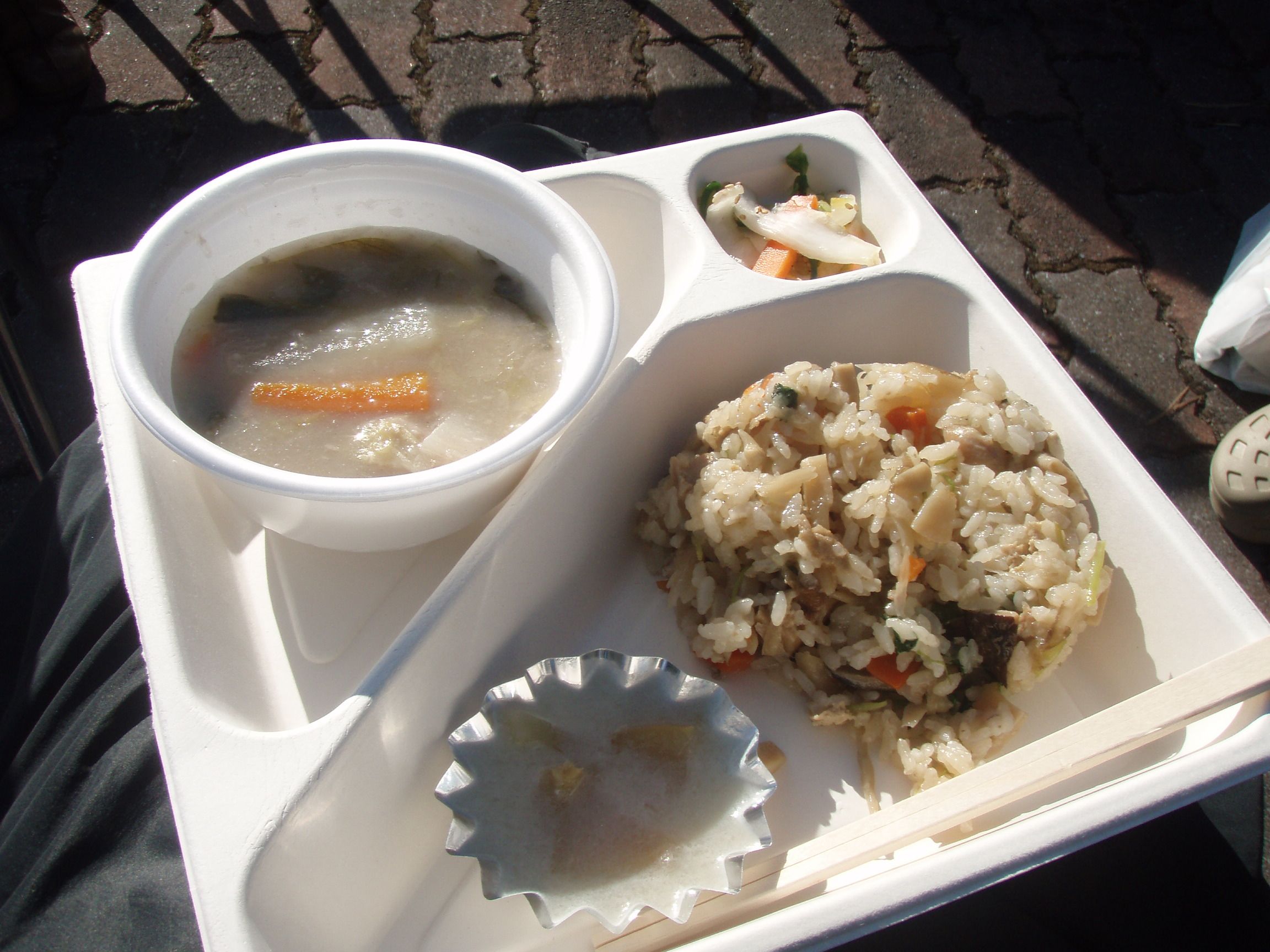 そば団子汁と炊きこみごはんとリンゴのゼリーでした。