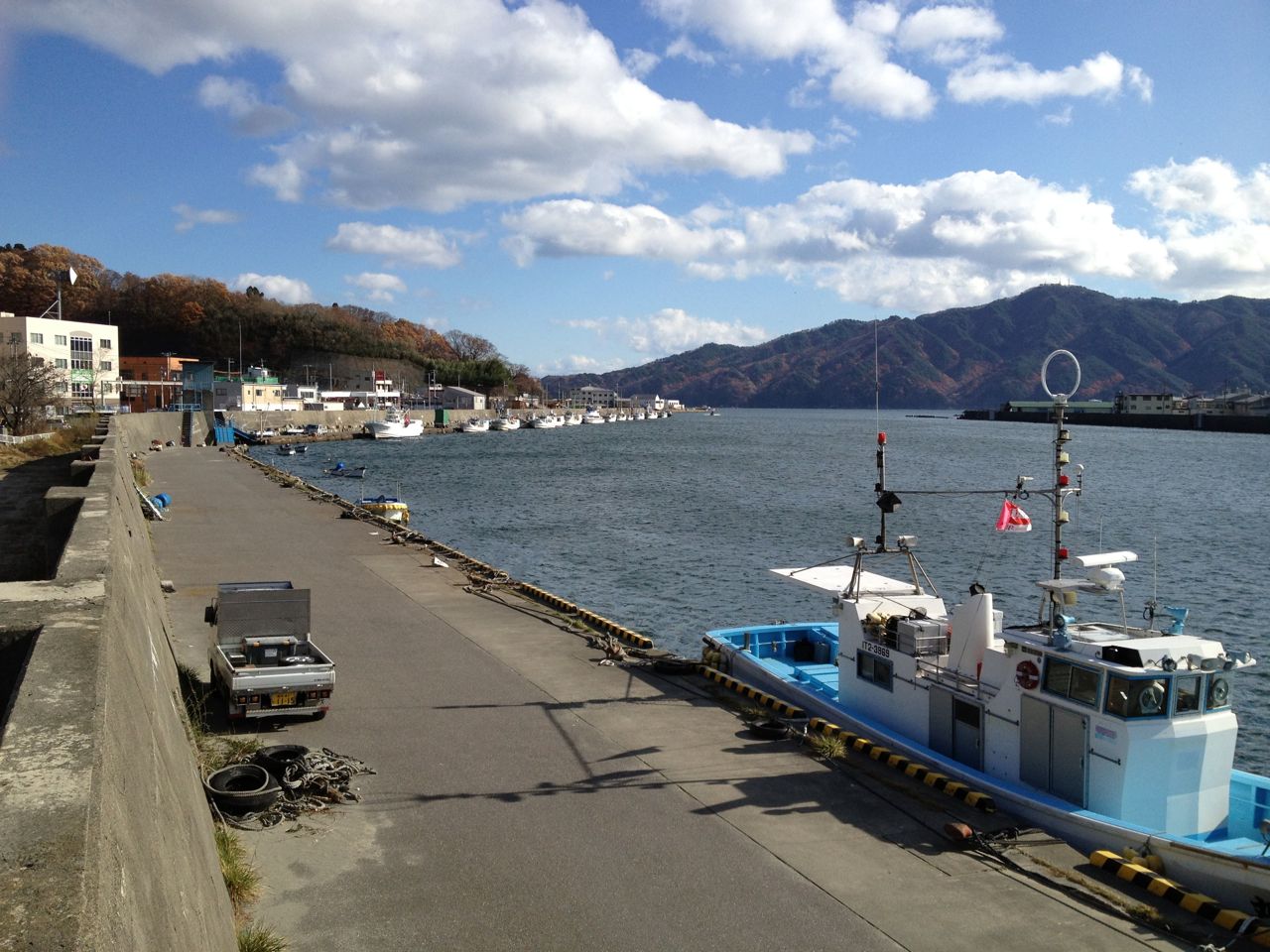 11月の港。新しい船が見えます!網を持つ人がいます!