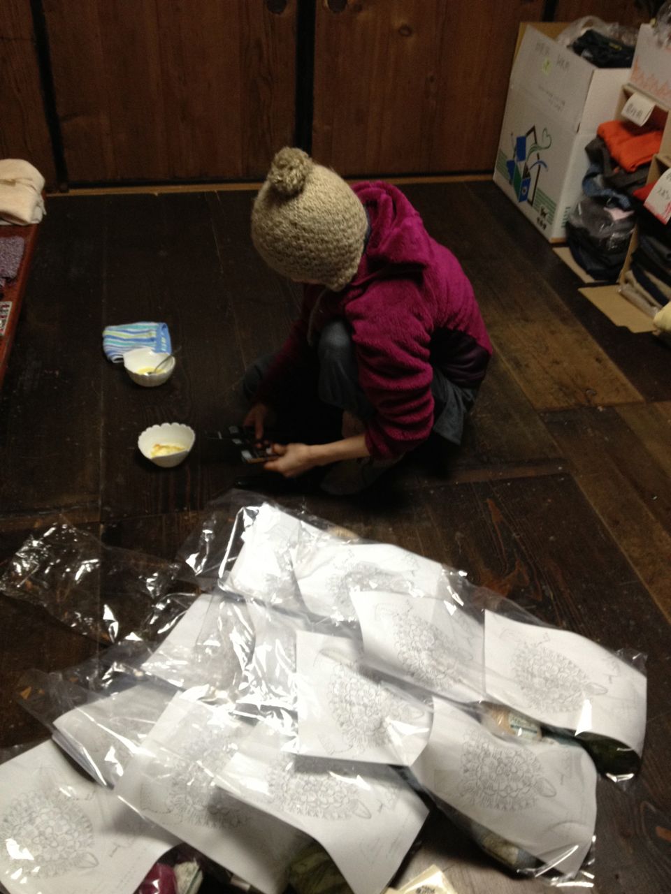 智子も、早速明日の準備。編み物説明会があります。そのことを瞑想しながら、キールタンを歌いながら。。。既に時は10時半です。