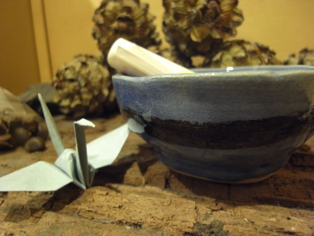 陶芸をなさる川村さんから、餞別にいただいた青い陶器椀と空色の鶴。大切にします。美しい青です。