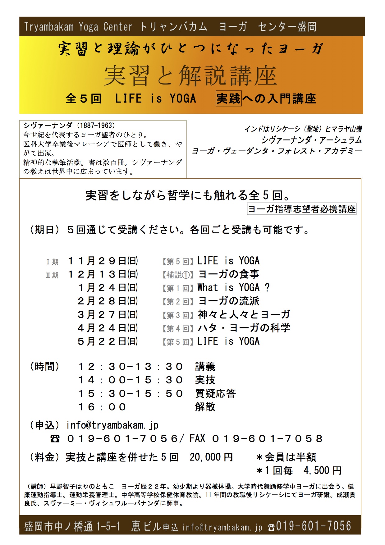 また、基礎コースを終えられた方対象のヨーガ哲学講座も同上日程の午前中に開講します。