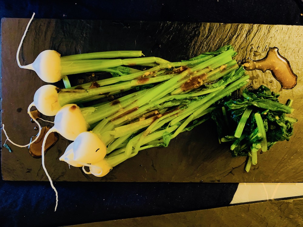 ・間引き子蕪のお浸しはマスタード実をゴリゴリすりこ木で擦るとマスタード粉に。それにお醤油を数滴。