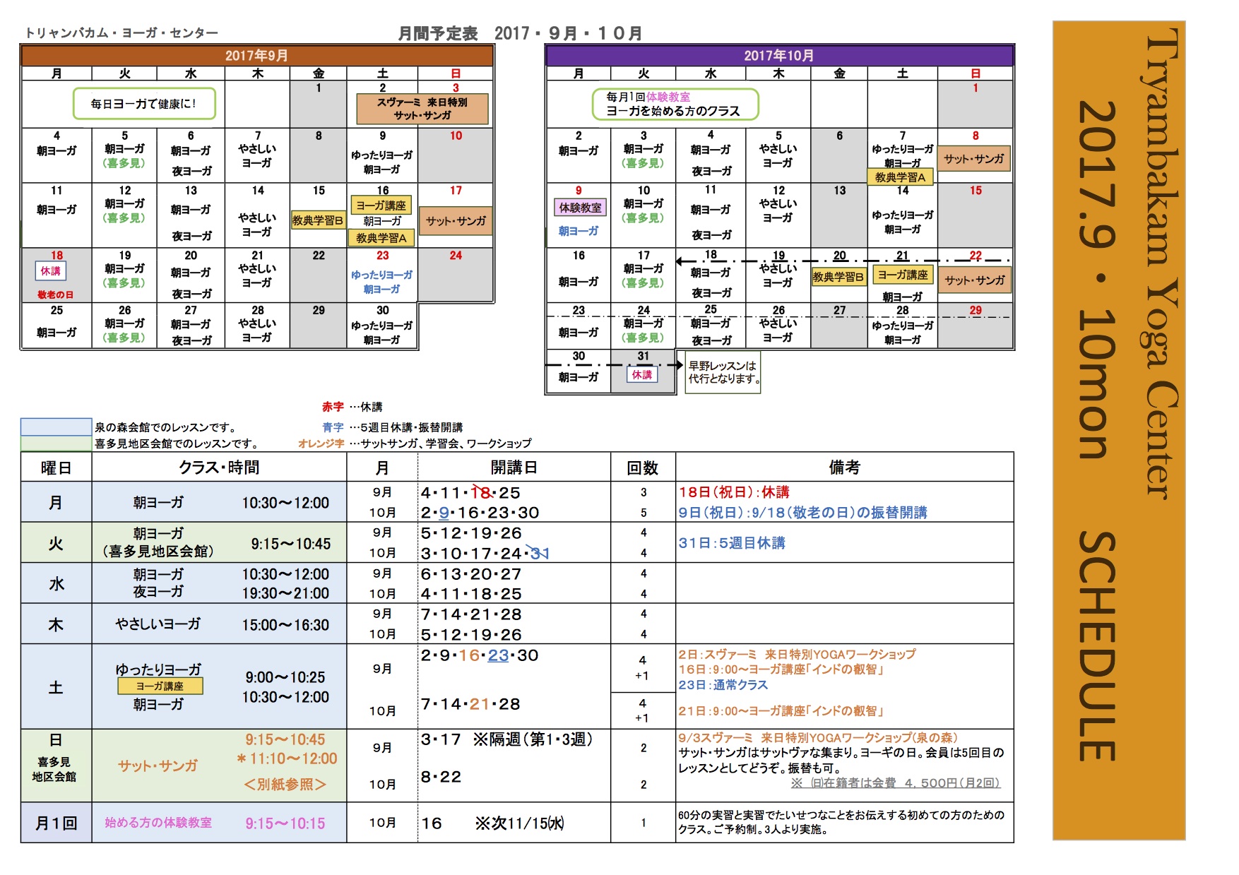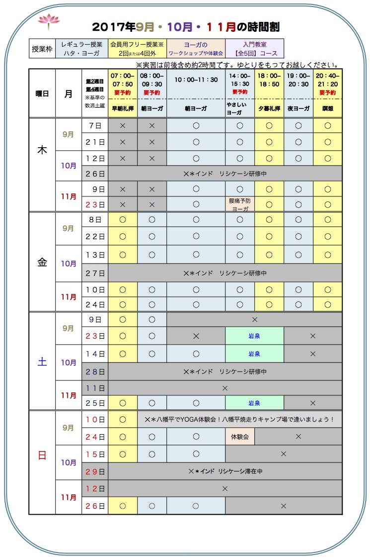 *9月24日㈰ 午後2時〜 体験教室。要予約。ヨーガを始めてみたいが少々不安や相談がある。という方のための初回者、体験者のための授業です。