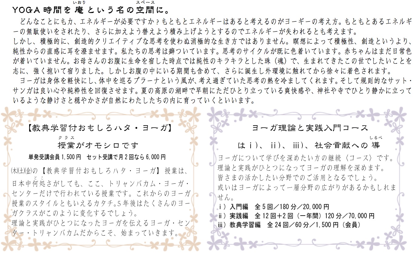 ■ 受講料:3,000円(トリャンバカム・ヨーガ・センター会員2,500円)